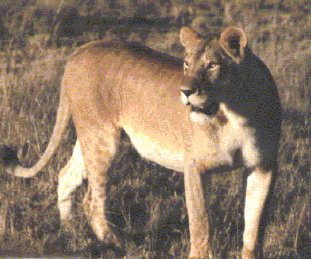 First, encounter with a lioness. Lioness hunts for the food. Males and cubs wait for the food to be brought to them. Here the lioness looks for an opportunity to seize a wildebeest.